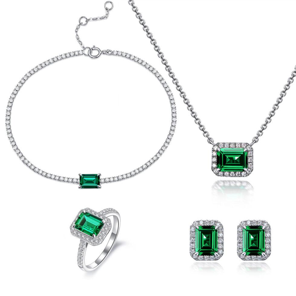 | AHQONE French Elegance Collection — An exquisite 4-piece set featuring 6×8mm emerald-cut lab-created emeralds in 925 silver. The classic "emerald cut + halo setting" design captures 19th-century French sophistication, with each piece wearable alone or as a coordinated ensemble for daily elegance. |